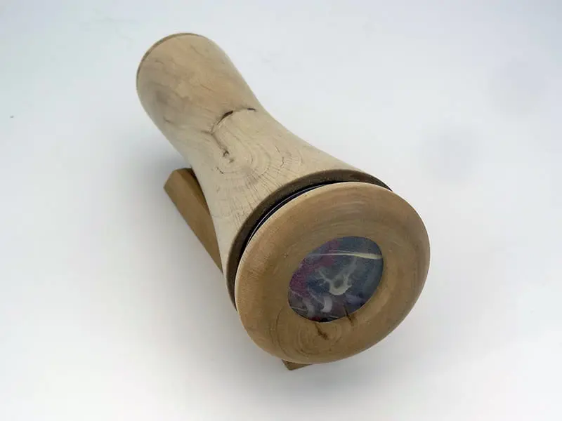 Ce kaléidoscope combine bois, verre et miroirs à haute réflexion pour offrir une image d’une grande netteté, sans décalage. Les éléments colorés de la chambre – éléments naturels verre de Murano, ou fragments de vitrail – dansent sous la lumière et créent un spectacle toujours renouvelé.
